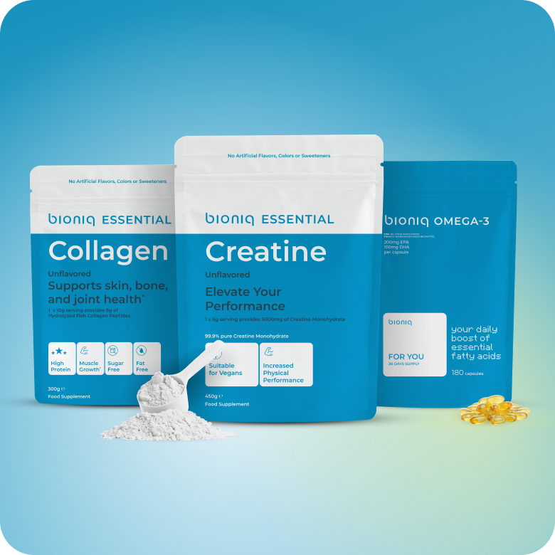 Bioniq ESSENTIAL is a curated selection of high-quality supplements in powder form, focusing on foundational support with Creatine, Marine Collagen, and Bovine Collagen powder.